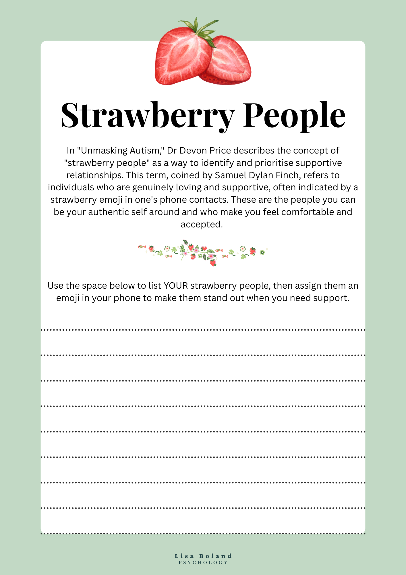 Digital Downloads Neuroaffirming Worksheet Bundle $30.00 Add To Cart Added! Social Anxiety Workbook $26.00 Add To Cart Added! Energy Accounting $6.00 Add To Cart Added! The 3 S's: Stims, Spins and Sensory Accomodations $6.00 Add To Cart Added! Strawberry People $6.00 Add To Cart Added! Strengths Cards $6.00 Add To Cart Added! Values Cards $6.00 Add To Cart Added! Dopamine Dispensers $6.00 Add To Cart Added! Neurodivergent Strengths Checklist $6.00 Add To Cart Added! Have Questions?admin@lisabolandpsychology.com(02) 46072839G02/21 Oaks StThirlmere, NSW